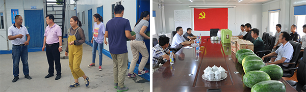 慰问组带着对辛勤奋战在一线职工的深切关心与爱护,每到一个工地,都会详细察看、询问工程建设情况,强调高温天气下的安全生产,叮嘱有关负责人合理调整劳动作业时间,做好后勤保障工作,加强对饮用水、食品和工地食堂的卫生管理,确保一线人员身体健康。同时,慰问组为各项目部送去了茶叶、绿豆、白糖、西瓜、毛巾、香皂等防暑降温品,把清凉送到了一线人员的心坎上。各项目部一致表示,将按照公司领导的要求,认真做好安全生产工作和施工现场防暑降温工作,确保工程建设顺利开展。